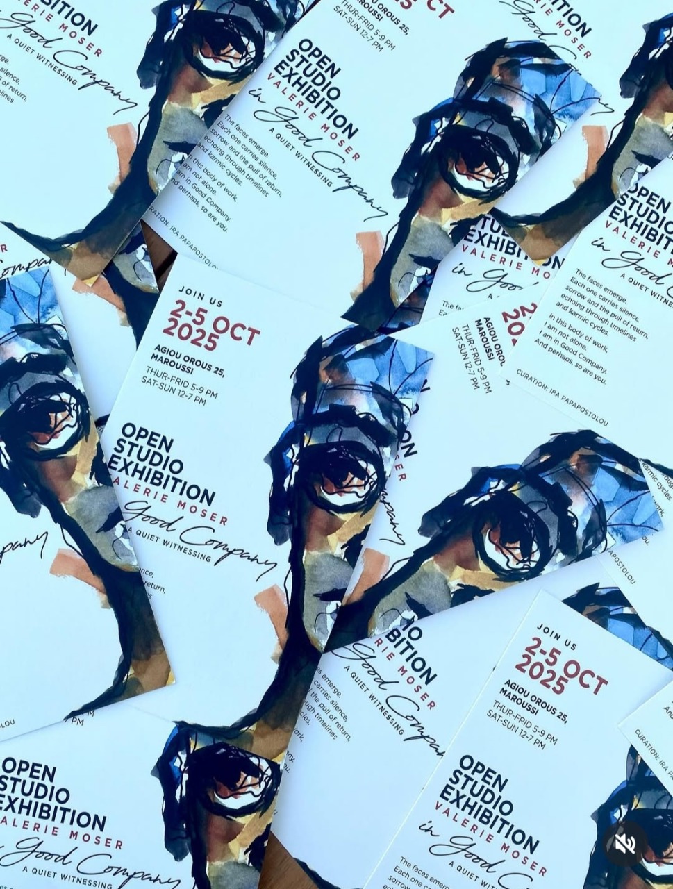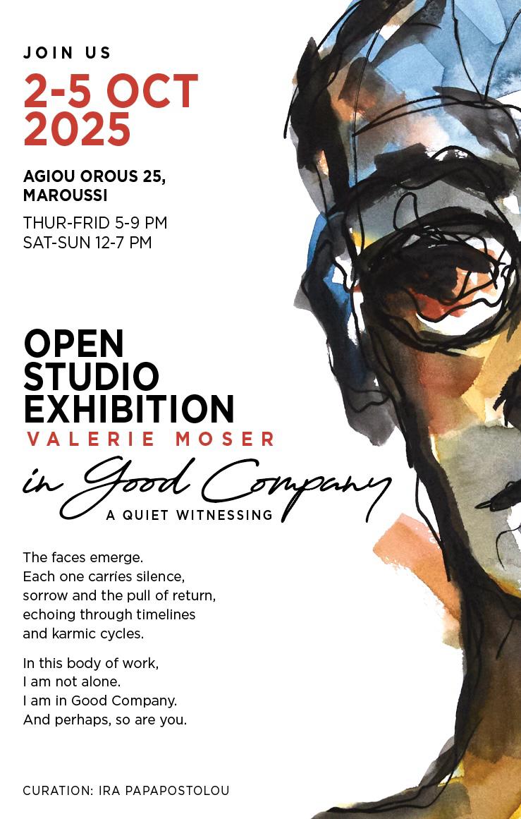 Η καλλιτέχνις Valerie Moser σας προσκαλεί στην πρώτη της ατομική έκθεση με τίτλο «In Good Company - A Quiet Witnessing» που θα πραγματοποιηθεί στο εργαστήριό της, από την Πέμπτη 2 Οκτωβρίου έως και την Κυριακή 5 Οκτωβρίου.