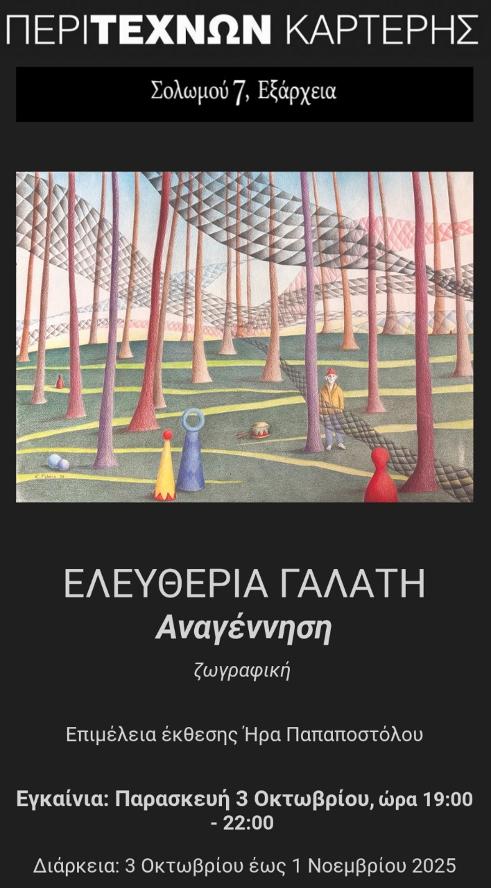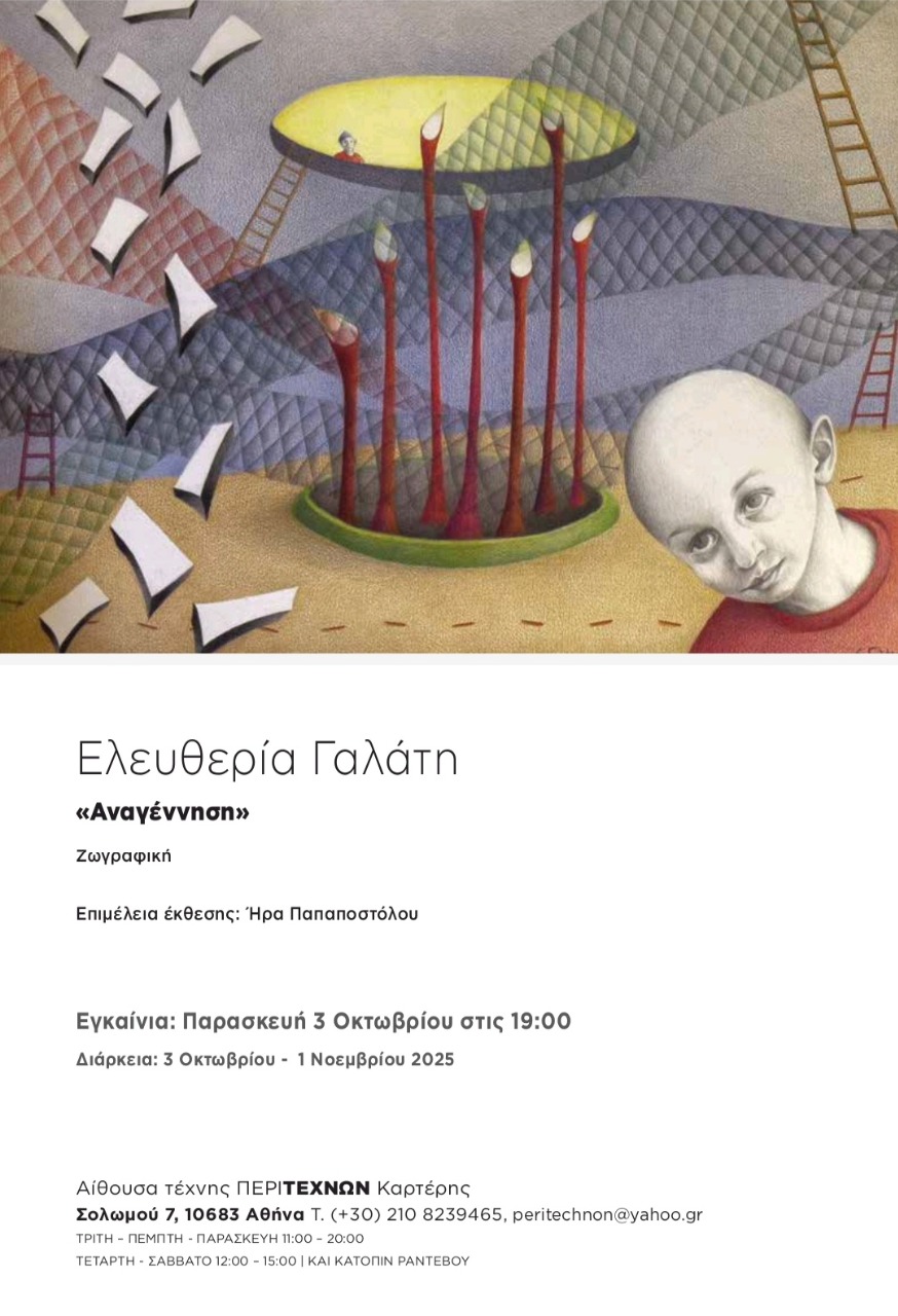 Η Αίθουσα Τέχνης ΠΕΡΙΤΕΧΝΩΝ Καρτέρης παρουσιάζει την ατομική έκθεση ζωγραφικής της Ελευθερίας Γαλάτη με τίτλο: «Αναγέννηση». Την επιμέλεια της έκθεσης έχει η Ιστορικός Τέχνης Ήρα Παπαποστόλου. Θα παρουσιαστούν έργα μικρών, μεσαίων και μεγάλων διαστάσεων που έχουν δημιουργηθεί με γραφίτη και ξυλομπογιές σε χαρτί somerset. Θα παρουσιαστούν επίσης ψηφιακά έργα τέχνης καθώς και μικρογλυπτά. Η έκθεση θα διαρκέσει έως το Σάββατο 1 Νοεμβρίου 2025.