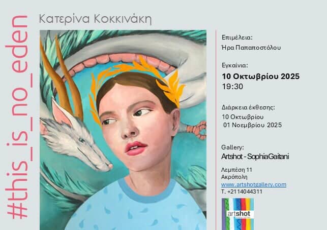 Η γκαλερί Artshot - Sophia Gaitani παρουσιάζει την ατομική έκθεσητης Κατερίνας Κοκκινάκη με τίτλο « #this_is_no_eden ».Η έκθεση εγκαινιάζεται την Παρασκευή 10 Οκτωβρίου, στο στενό της Λεμπέση κάτω από την Ακρόπολη.