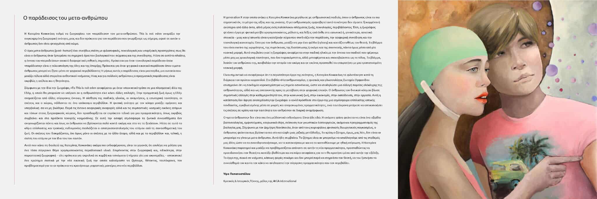 Η Κατερίνα Κοκκινάκη τολμά να ζωγραφίσει τον «παράδεισο» του μετα-ανθρώπου. Ο όρος μετα-άνθρωπος (post- human) έχει συνήθως σχέση με φιλοσοφικές, τεχνολογικές και υπαρξιακές προσεγγίσεις: πως θα είναι ο άνθρωπος όταν ξεπεράσει τα σημερινά όρια του βιολογικού του σώματος και της συνείδησης. Μέσα σε αυτό το πλαίσιο, η έννοια του «παραδείσου» αποκτά διαφορετικές σημασίες. Μήπως, όμως, είναι τελικά μια παγίδα, μια ουτοπία που μοιάζει τέλεια, αλλά στερείται αυθεντικού νοήματος;, μας κάνει να αναρωτηθούμε η ζωγράφος.Επιμένοντας στην παραστατική ζωγραφική - είτε πρόκειται για ακρυλικά σε καμβά και τυπώματα ή νήματα είτε για ακουαρέλες - οπτικοποιεί ένα ερώτημα σχετικά με την νέα εικονική ζωή την οποία καλούμαστε να ζήσουμε θέτοντας, ταυτόχρονα, τον προβληματισμό για το αν πρόκειται να κρατήσουμε ρομαντικές μανιέρες στο νέο περιβάλλον. Η ζωγραφική της είναι καθαρά ανθρωποκεντρική μιας και ανήκει στην generation X, δημιουργώντας ένα ρήγμα σε σχέση με τη φιλοσοφία του μετα-ανθρώπου όπου το άτομο δεν είναι το κέντρο. Από τους καμβάδες της περνούν άνθρωποι χωρίς φύλλο (Cyborg), μέρη ενός πολύπλοκου πλέγματος ζωής, τεχνολογίας, περιβάλλοντος.