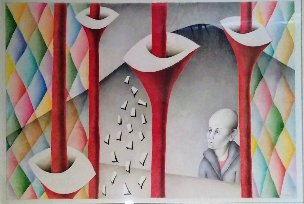 Πρώτα γεννιούνται τα φυτά και τα δέντρα της, µε τον πολύ χαρακτηριστικό τρόπο σχεδίασης τους, όπως τα έχει φιλοτεχνήσει και στο παρελθόν. Μικρά κεφάλια, σαν ξωτικών, προβάλλουν µέσα στην πυκνή βλάστηση, ενώ σιγά σιγά παίρνουν µεγαλύτερες διαστάσεις και άλλη θέση µέσα στο χώρο. Κάποιες φορές έχουν το ρόλο του θεατή µέσα σε έναν κόσµο που µεταβάλλεται. Προσπαθούν να προσαρµοστούν και να επιβιώσουν. Στη συνέχεια, µπαίνουν στο έργο της ορισµένα επαναλαµβανόµενα µοτίβα, οι γνωστοί ρόµβοι της, που έχουν διπλό χαρακτήρα: από διακοσµητικά στοιχεία µετατρέπονται σε δίχτυ το οποίο άλλοτε χάνεται και άλλοτε µένει εκεί ως πιθανή παγίδα µέσα σε ένα παιχνίδι.